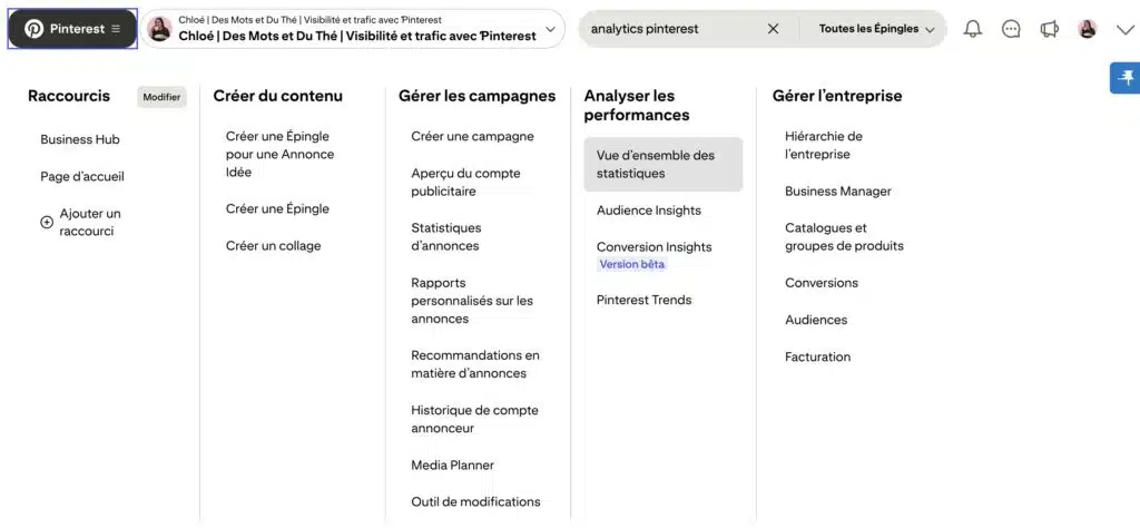 Pour voir tes analytics Pinterest, tu vas aller dans le menu de ton compte (en cliquant sur le logo Pinterest tout à gauche) puis dans la colonne Analyser les performances, où tu vas cliquer sur « Vue d’ensemble des statistiques ». Si ton menu est un peu différent du mien, c’est normal : Pinterest a fait une mise à jour qui n’a pas été déployée sur tous les comptes. Mais dans tous les cas, tu devrais avoir une colonne « Analyser les performances ».