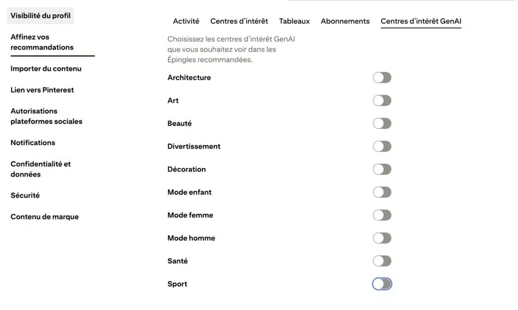 Pour ça, il faut aller dans tes paramètres, puis dans « Affinez vos recommandations » et, enfin, dans l’onglet « Centres d’intérêt GenAI ». Là, tu pourras décocher toutes les thématiques pour lesquelles tu ne veux pas voir d’images IA.